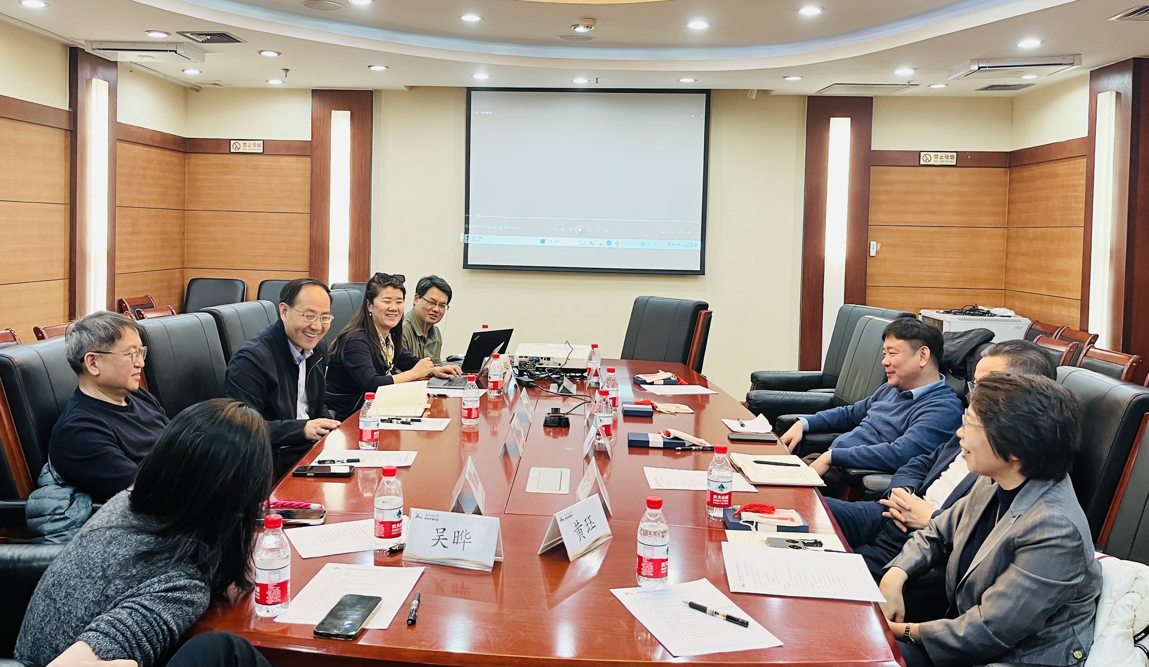 在北京师范大学LEDONG.COM,副院长卜师霞、张莉、李小龙出席会议,双方就创意写作学位点建设、学科目录与学科布局调整,研究生学科命题等问题展开深入交流。在北京师范大学新闻传播学院,学院书记方增泉,院长张洪忠,副书记祁雪晶,副院长周敏,院长助理吴晔、修利超,院办主任黄珏出席会议,双方围绕科研国际化、计算传播学学科建设和马新观课程体系建设等议题进行了深入的探讨,随后学院一行参观了北京师范大学新闻传播学院新文科实验室。